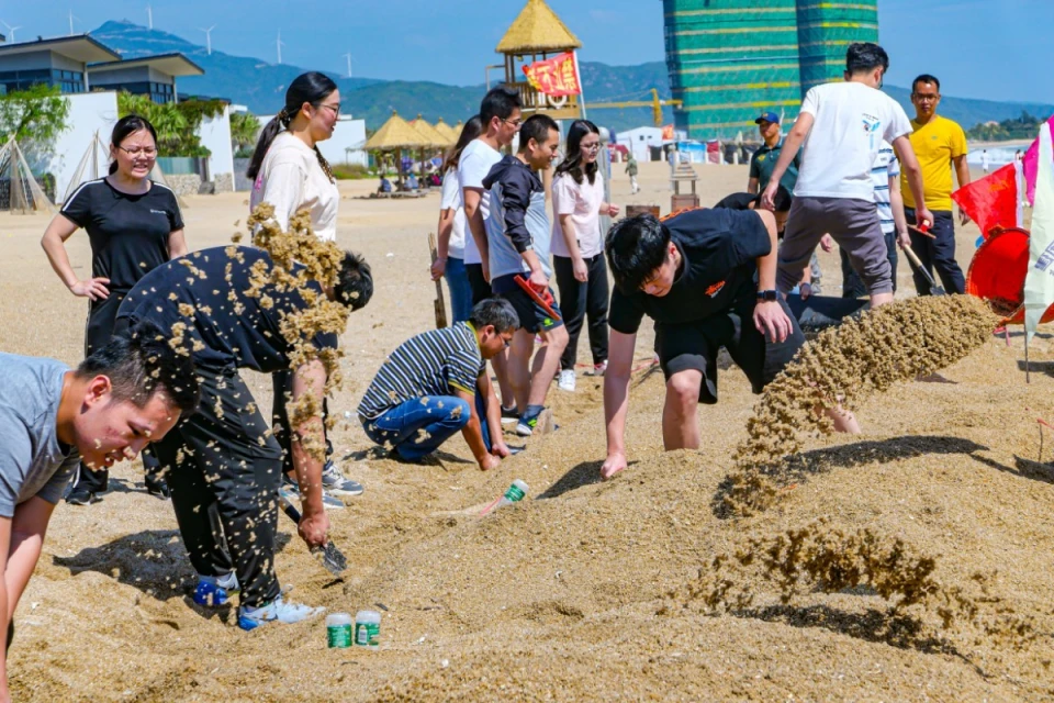 18日上午,所有的參會(huì )人員在酒店大堂集合,前往沙灘進(jìn)行團建。經(jīng)過(guò)前一天的熟悉,大家已經(jīng)打破了彼此的壁壘,加上在經(jīng)驗豐富的教練的帶領(lǐng)下,大家的興致被很快調動(dòng)起來(lái)。團建活動(dòng)主要有兩大活動(dòng)——“世界球”和“創(chuàng )意沙雕”。在“世界球”中,各組需要按照既定路線(xiàn)讓網(wǎng)球走遍整個(gè)世界地圖,并且途中不能掉進(jìn)洞中。這個(gè)活動(dòng)個(gè)考驗的是大家的協(xié)作配合能力,只有當所有隊員的思維保持一致時(shí),才能讓球保持住平衡,順利地到達終點(diǎn)。