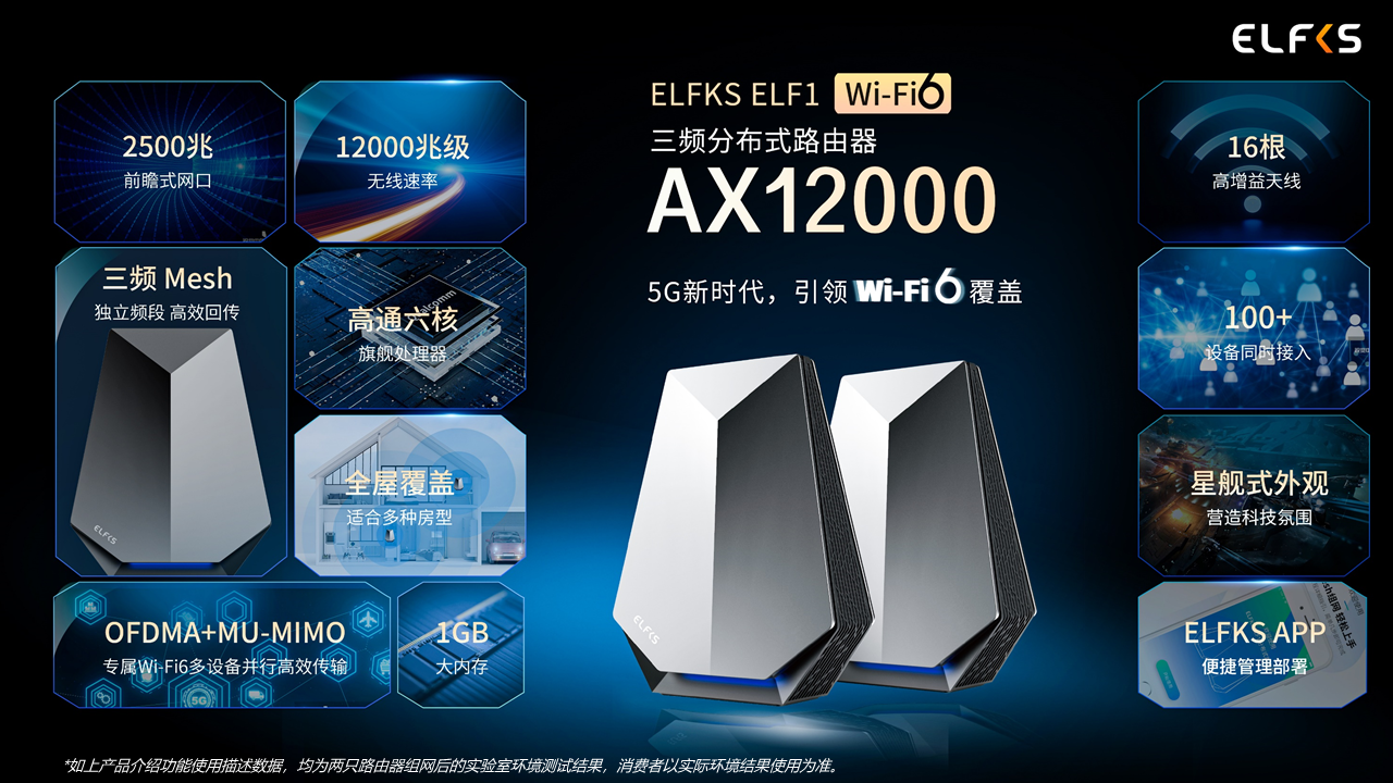 從去年亞馬遜上線(xiàn)Wi-Fi 5 Mesh產(chǎn)品,再到今年年初發(fā)布5G CPE Pro產(chǎn)品,金信諾始終保持在消費類(lèi)終端產(chǎn)品的投入和研發(fā)。特別是針對智慧家居場(chǎng)景的深度覆蓋,在不斷的探索積累之后,金信諾在發(fā)布會(huì )上為大家帶來(lái)了重磅新品——ELFKS AX12000三頻Wi-Fi 6分布式路由器。
