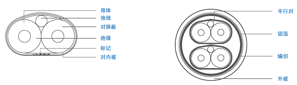 | 導體:24 AWG 單根鍍銀銅線(xiàn), 外徑0.508 mm | 半成品:2 對 (#1-2) 一起成纜 |
