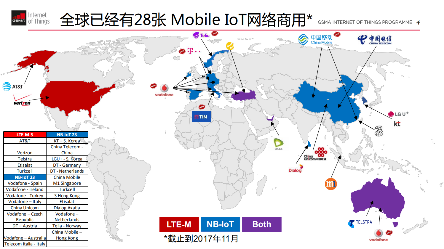 圖:全球移動(dòng)物聯(lián)網(wǎng)商用情況(數據截止到2017年11月),來(lái)源:GSMA。